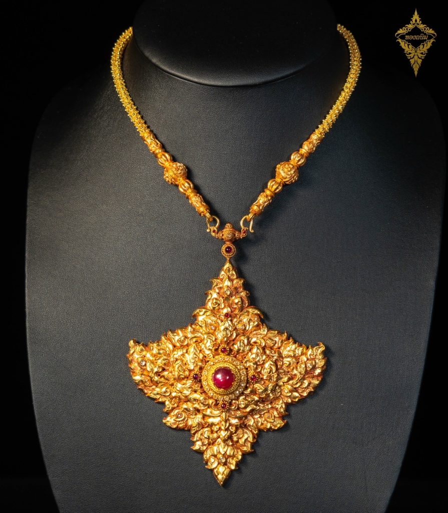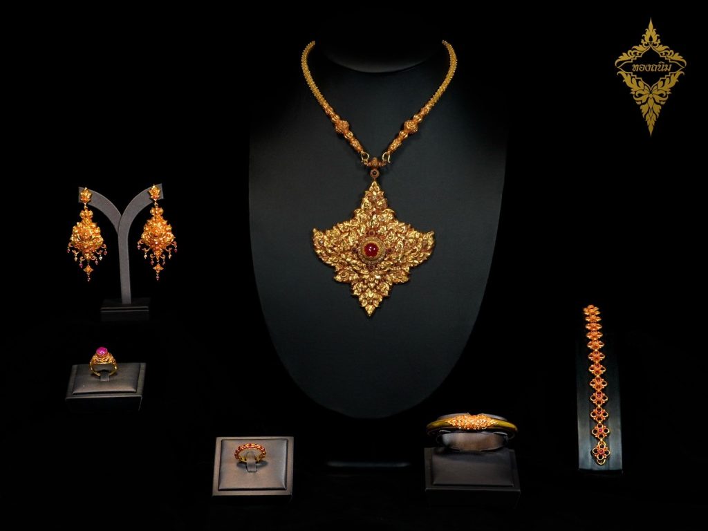 ถนิมพิมพาภรณ์ ในสำรับประกอบด้วย ทับทรวง สร้อยคอ ต่างหู กำไล แหวน และสร้อยข้อมือ แต่ละชิ้นล้วนถูกสร้างสรรค์ขึ้นอย่างมีเอกลักษณ์ รังสรรค์ด้วยกรรมวิธีแบบโบราณ ผสมผสานด้วยเทคนิคที่หลากหลาย ทั้งเทคนิคการสลักดุนแบบช่างทองหลวง เทคนิคการเดินลวดแบบอยุธยา เทคนิคการประดิษฐ์และประกอบไข่ปลา ผลงานล้วนประณีตและพิถีพิถัน