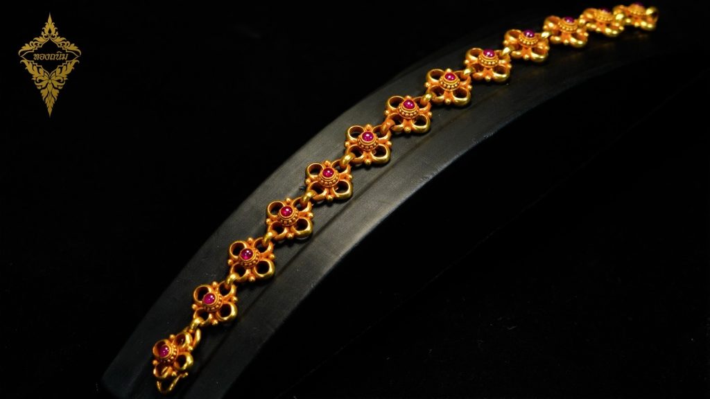 เครื่องประดับเด่นในสำรับ ได้แก่ ทับทรวงทองคำ “แก้วปัทมราช” ออกแบบเป็นลวดลายกระจังใบเทศ อันเป็นหนึ่งในแม่ลายสำคัญของศิลปะไทย สื่อถึงความอุดมสมบูรณ์และความเจริญงอกงามของสรรพชีวิต ประดับอัญมณีเม็ดยอด ด้วยทับทิมสีแดงเลือดนก น้ำหนักทับทิม 28 กะรัต สัญลักษณ์ของอำนาจและบารมี นอกจากนี้ยังมีสร้อยคอลวดลายดอกพิกุล ปลายสร้อยสลักดุนเป็นรูปดอกพุดตาน อันเป็นดอกไม้มงคลที่สื่อถึงความเจริญรุ่งเรือง