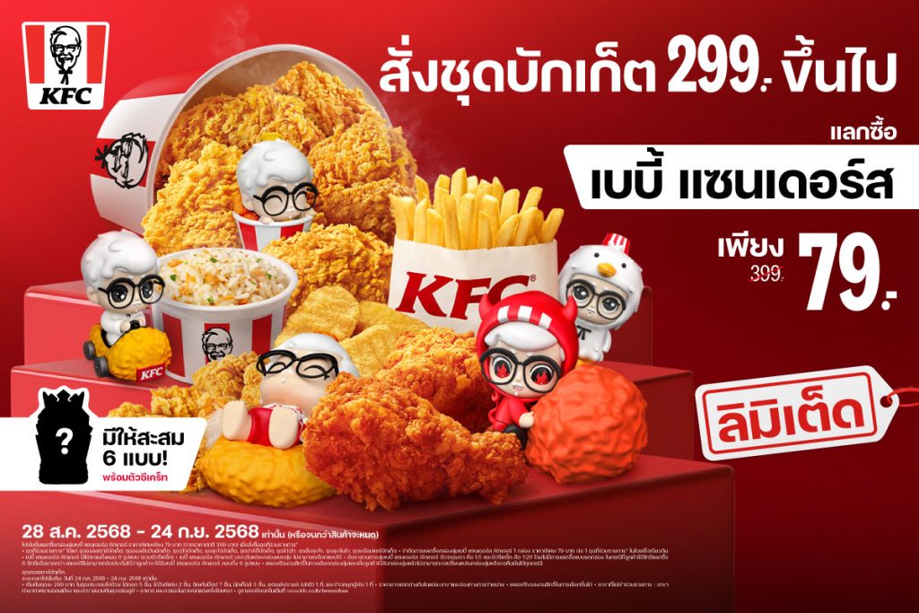 ร่วมสะสม “เบบี้ แซนเดอร์ส คอลเลกชัน” ให้ครบทั้ง 6 คาแรกเตอร์ฉลองเดือนเกิดผู้พันปีนี้ไปด้วยกัน เพียงอิ่มอร่อยกับชุดเมนูคอมโบตั้งแต่ 299 บาทขึ้นไปที่ร่วมรายการ ได้แก่ ชุดออลสตาร์บักเก็ต, ชุดออลอินวันบักเก็ต, ชุดจุใจบักเก็ต, ชุดสุขใจบักเก็ต, ชุดปาร์ตี้บักเก็ต, ชุดไก่จุใจ, ชุดอิ่มสุขใจ, ชุดสุขล้นใจ, ชุดพร้อมแชร์บักเก็ต ที่หน้าร้าน KFC ทุกสาขาทั่วประเทศ (ยกเว้นสาขาท่าอากาศยานดอนเมือง และสาขาสนามบินสุวรรณภูมิ), KFC Delivery บนเว็บไซต์ และ KFC App รวมไปถึงแพลตฟอร์มเดลิเวอรีทุกช่องทาง รับสิทธิ์แลกซื้อกล่องสุ่มเบบี้ แซนเดอร์ส คอลเลกชัน 1 กล่อง ในราคาพิเศษเพียง 79 บาท จากปกติตัวละ 399 บาท (1 สิทธิ์แลกซื้อ ต่อ 1 ชุดเมนูที่ร่วมรายการในใบเสร็จเดียวกัน) แฟน KFC ตัวจริงและสายจุ่มไม่ควรพลาด!