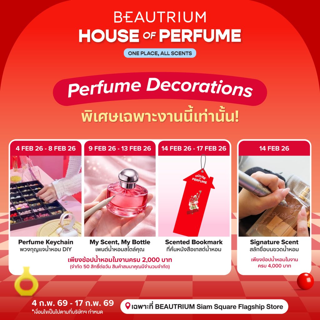 BEAUTRIUM กลับมาอีกครั้งกับเทศกาลน้ำหอมแบรนด์ดังระดับโลกที่หลายคนรอคอย “HOUSE OF PERFUME : ONE PLACE, ALL SCENTS” บิวเทรี่ยมเปิดอาณาจักรน้ำหอมที่จัดขึ้นอย่างต่อเนื่องเป็นปีที่ 3 ตอกย้ำความตั้งใจของ BEAUTRIUM ในการสร้างพื้นที่แห่งประสบการณ์ความหอม พร้อมเปิดรับทุกตัวตนของคนรักน้ำหอมอย่างแท้จริง ระหว่างวันที่ 4 – 17 กุมภาพันธ์ 2569 ณ BEAUTRIUM Siam Square Flagship store