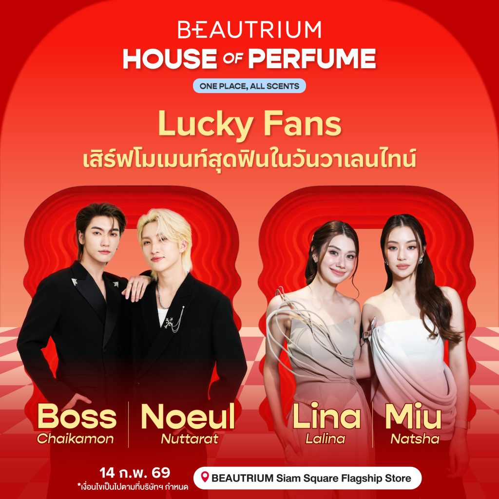 และในเดือนแห่งความรักนี้ BEAUTRIUM ยังเติมเต็มบรรยากาศให้หวานละมุนยิ่งขึ้น ด้วยกิจกรรม Meet & Greet สุดเอ็กซ์คลูซีฟ ที่พร้อมเสิร์ฟโมเมนต์สุดฟินและความประทับใจให้กับแฟนคลับผู้โชคดี ในวันวาเลนไทน์ จากคู่จิ้นสุดฮอต “บอส ชัยกมล – โนอึล ณัฐรัชต์” ที่รอเสิร์ฟความฟินพร้อมดื่มดำไปกับกลิ่นอายสุดคลาสสิคของ ARMANI SI เคียงคู่ไปกับความสดใสจาก “ลีน่า ลลินา – หมิว ณัชชา” ที่มาร่วมสร้างช่วงเวลาแห่งความทรงจำในวันวาเลนไทน์ ในบ้านน้ำหอมหลังใหญ่แห่งนี้ ให้อบอวลไปด้วยกลิ่นอายของความรัก ณ BEAUTRIUM Siam Square Flagship Store ชั้น 4 ในวันที่ 14 กุมภาพันธ์ 2569