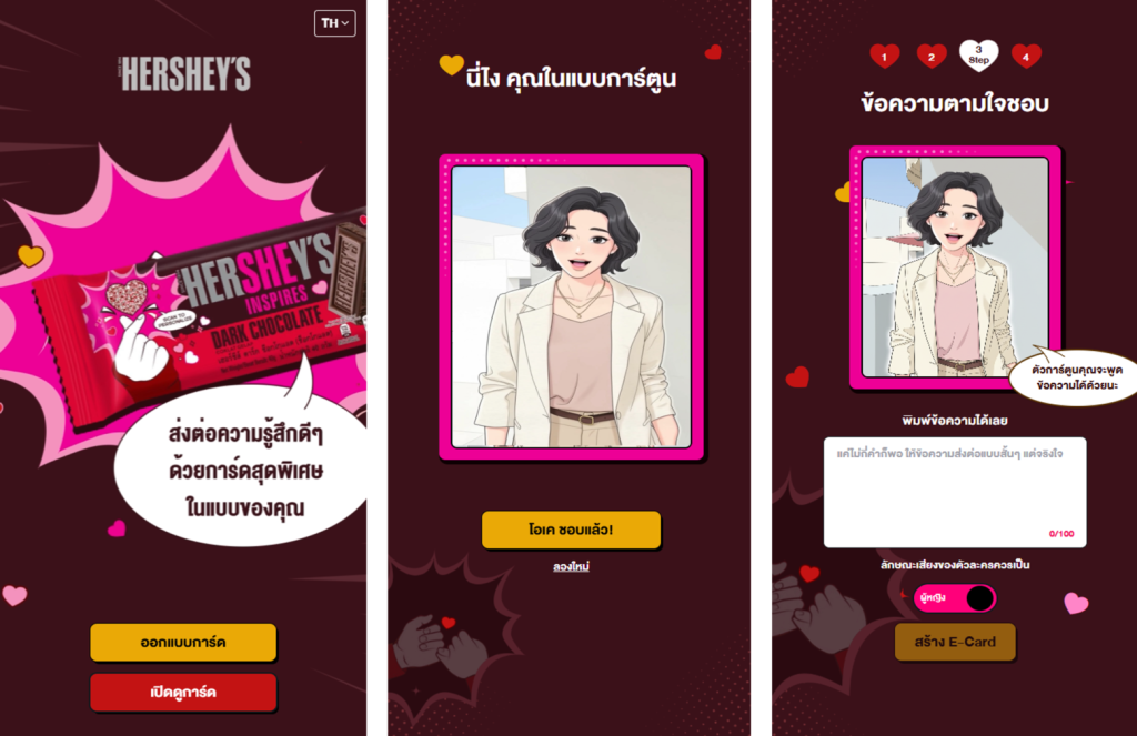 ภายใต้แนวคิด ‘Love for Every Bar’ แพ็คเกจรุ่นลิมิเต็ดอิดิชันของเฮอร์ชีส์ได้กลายเป็นผืนผ้าแคนวาสดิจิทัลเพื่อสื่อความรู้สึกในแบบของตัวเอง ผ่านแพลตฟอร์มดิจิทัลที่ใช้งานง่าย เพียงสแกน QR Code บนแพ็คเกจรุ่นลิมิเต็ด ก็สามารถสร้าง คาแรกเตอร์การ์ตูนเฉพาะตัว ผ่านไมโครไซต์ celebratehershe.com/th เพื่อส่งต่อคำอวยพรจากใจให้ออกมาในรูปแบบแอนิเมชันน่ารัก — พร้อมมอบเป็นของขวัญแทนความรู้สึกให้กับคนพิเศษ